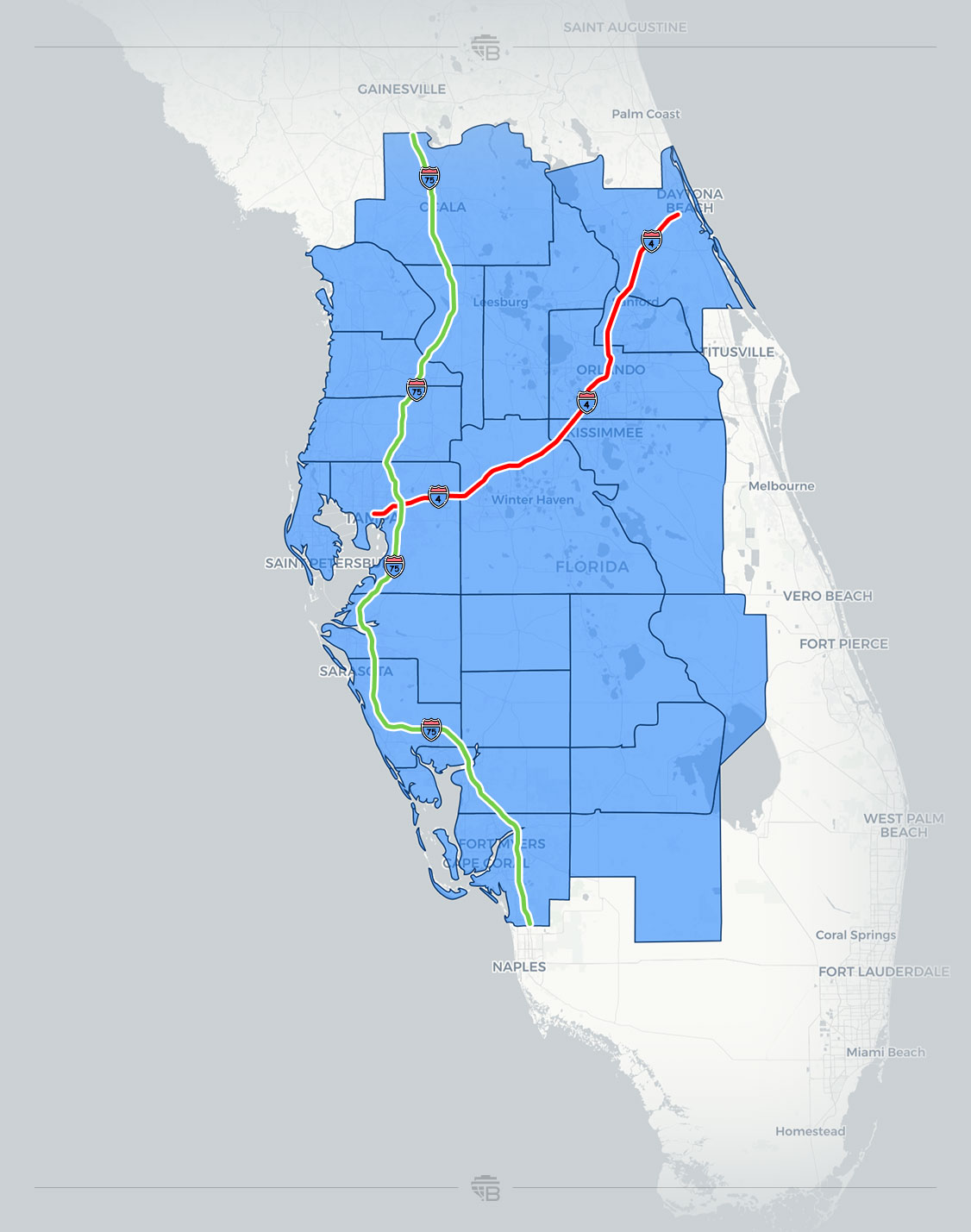 Home to more than 8 million residents and over 60 million visitors annually. Central Florida is the state’s fastest growing region, and is expected to outpace the growth of south Florida by more than 2 to 1 for the next several years (U.S. Census). The region is anchored by the I-4 corridor from Tampa to Orlando, which contains the largest concentration of distribution centers in the Southeast.